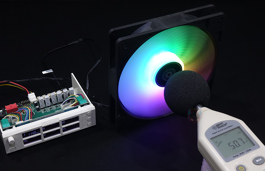 실버스톤 Air Penetrator 184i ARGB 팬은 최대 1200RPM 속도에 3m까지 풍량이 전달된다고 언급하고 있는데, 실제로 사용해보면, 충분히 언급한 거리만큼 도달할 수준의 바람전달을 체감할 수 있으며, 1200RPM 근접속도에서 소음측정을 해보면, 약 50~51dB(A) 수준으로 근접한 상태에서 측정한 수치치고는 낮은 편이라할 수 있습니다. 즉, 바람세기 대비 소음이 낮다라는거죠. 실제로 PC케이스에 장착해서 사용한다면 이보다 더 낮게 소음이 들리기 때문에 사실상 소음에 대한 우려는 가지지 않아도 되겠습니다.