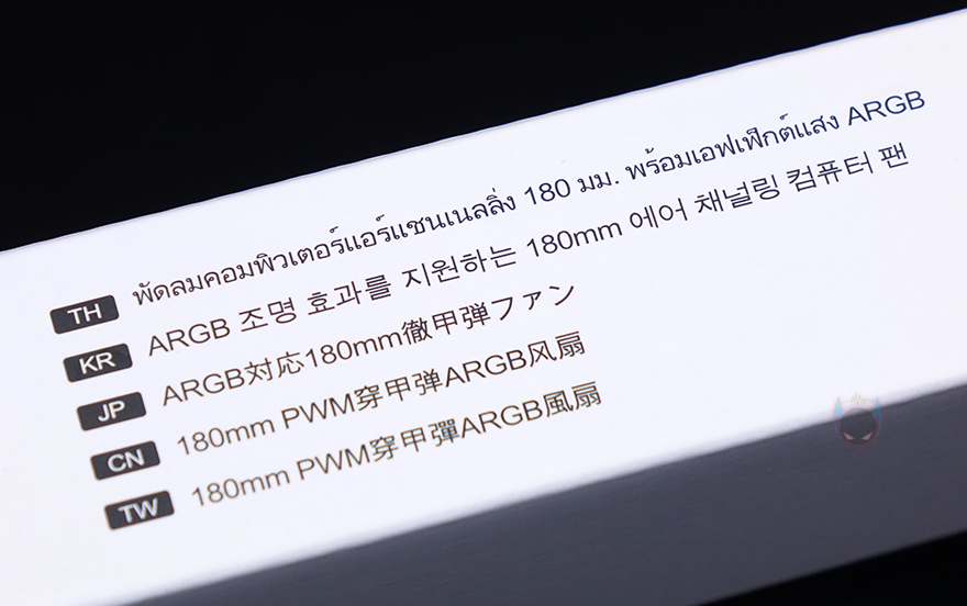 제품 팩키지는 박스형태로 전면에는 제품 이미지를 담고 있는데, 한눈에 봐도 RGB 팬이라는 것을 알 수 있죠. 그리고, 모델명과 함께 아래에는 ASUS, ASRock, 기가바이트, MSI, 바이오스타에서 지원하는 ARGB Sync와 연동된다는 표기도 확인할 수 있습니다. 박스 측면에는 한국어를 포함해 간략하게 제품 컨셉 문구를 담고 있으며, 박스 후면에는 베어링, 연결방식, 풍량, 소음, 크기 등의 제품 기본사양표기를 확인할 수 있죠.