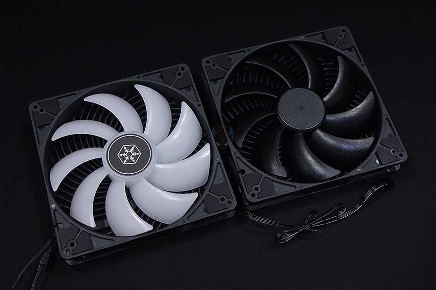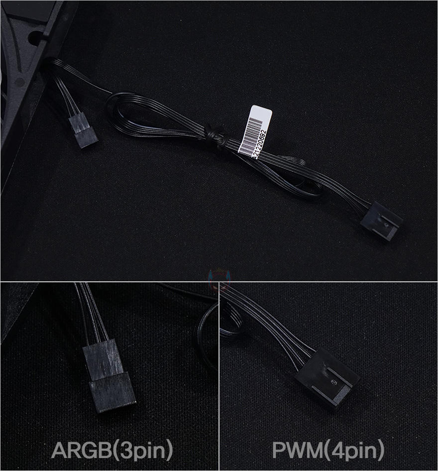 케이블은 팬 작동을 위한 PWM방식의 4Pin 전원케이블과 RGB 조명효과를 위한 3Pin 커넥터가 팬에 연결되어 있는데, 3pin 커넥터는 구성품에서 본 ARGB 연장케이블을 연결해서 사용합니다. 그리고, 2개이상의 팬 사용시 동시에 RGB 연동을 할 수 있게 3pin 연장케이블도 제공해주고 있으며, ARGB 연장케이블에도 다른 ARGB 장치와 연결할 수 있게 암/수 커넥터가 적용되어 있습니다.