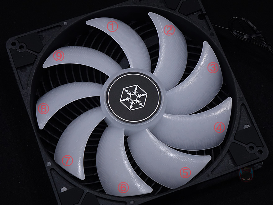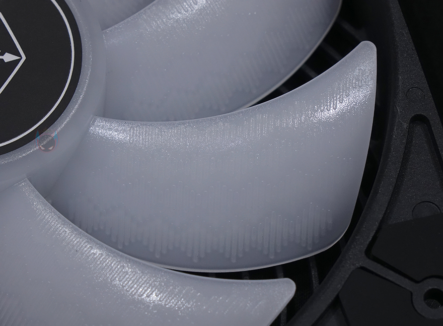 팬 날개(Blade)는 총 9개로 RGB 조명효과를 위해 반투명으로 처리했으며, 가까이서 보면 일정한 패턴 디자인이 적용되어 있는데, 제조사는 이를 샤크 포스(Shark Force)라고 명칭하고 있습니다. 보통 이런 팬 날개에 패턴 디자인이 적용되면 일명 상어라는 단어를 많이 사용하죠. 또한, 이 샤크 포스 디자인 역시 역할은 다른 제품들처럼 좀 더 공기흐름을 매끄럽게 하면서 소음을 줄이기 위한 방안이라고 보면 됩니다. 그리고, 팬 나사홀 주변에는 진동소음을 줄이기 위해 앞뒤 모두 패드를 기본 부착하고 있으며, 나사홀은 180mm와 200mm 규격 2가지를 적용하고 있어서 장착호환성을 넓혔습니다.