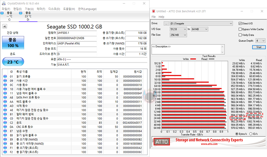 직접, 씨게이트 Fast One Touch SSD 데이터복구 외장SSD를 사용해보면, 일단 PC나 노트북에 연결해 인식이 되면 포트 옆에 적용된 화이트색상의 LED인디케이터가 점등되는 것을 확인할 수 있습니다. 그리고, Fast One Touch SSD 데이터복구 외장SSD는 500GB/1TB/2TB 3가지 용량으로 출시되었는데, 리뷰에 사용된 모델의 용량은 1TB이며, 기본적인 저장장치 스펙속도 표기로 사용되는 ATTO Disk Benchmark에서 실행해보면, 읽기와 쓰기 모두 약 1,000MB/s 근접 내외수준인것을 확인할 수 있습니다. 물론, 앞서 제품박스에 부착된 스펙상의 속도보다는 조금 낮지만, Fast One Touch SSD 데이터복구 외장SSD USB 규격이 USB 3.1방식으로 10Gbps를 지원한다라는 점에서 10Gbps 기준에는 도달하는 속도입니다.
