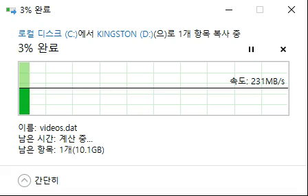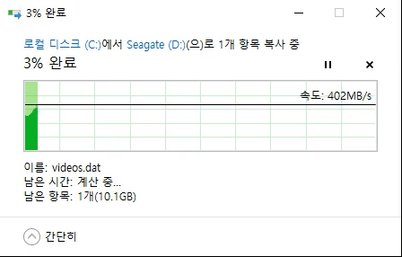 그리고, 현재 외장SSD는 내장용 SSD와 마찬가지로 NVMe 방식과 S-ATA 방식으로 나뉘어지고 있는데, Fast One Touch SSD 데이터복구 외장SSD는 NVMe SSD 방식으로 실제 S-ATA 방식의 외장SSD와 CrystalDiskMark로 속도비교를 해보면, 2배 가까이 차이나는 것을 확인할 수 있습니다. 또한, 이런 NVMe 외장SSD는 대용량 파일전송일수록 S-ATA 외장SSD와 속도체감을 더 확실하게 보여주는데, 실제 10GB 대용량파일을 전송해보면, Fast One Touch SSD 데이터복구 외장SSD가 일정한 속도유지로 변동이 심한 S-ATA 외장SSD보다 더 빨리 전송되는 것을 확인할 수 있습니다.