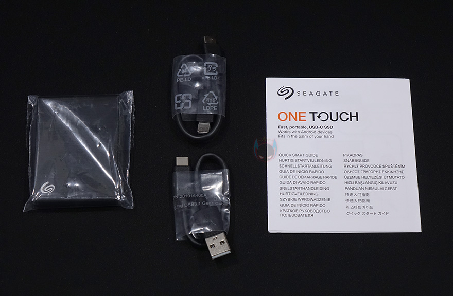제품포장은 기본적인 비닐 포장식이며, 제품구성은 Fast One Touch SSD 데이터복구 외장SSD, 데이터 케이블 2개, 제품설명서로 이루어져 있는데, 데이터 케이블은 하나는 양쪽 모두 USB Type-C 인터페이스를 가진 케이블이며, 나머지 하나는 USB Type-A와 Type-C로 인터페이스를 가진 케이블입니다. 참고로, USB 버전은 방금 레스큐 데이터 복구 서비스 스티커에 표기된 읽기/쓰기속도를 본 소비자라면 쉽게 파악할 수 있듯이, USB 3.1버전을 지원합니다.