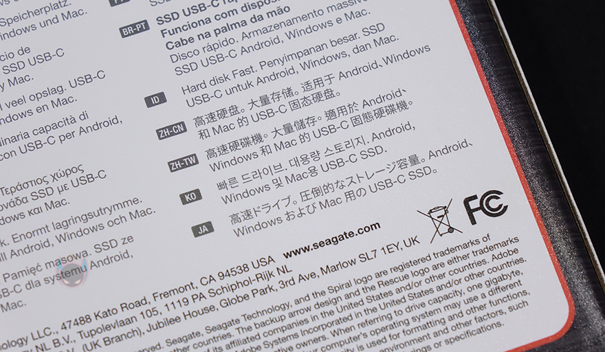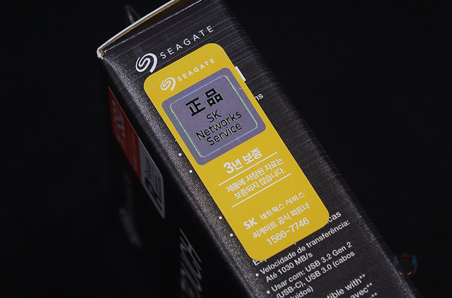 제품박스부터 살펴보면, 전면에는 제품이미지와 함께 모델명 그리고, 씨게이트의 모든 제품에서 볼 수 있는 레스큐 데이터 복구 서비스 지원 스티커를 용량표기와 읽기/쓰기속도표기와 함께 확인할 수 있습니다. 레스큐 데이터 복구 서비스는 씨게이트의 대표적인 데이터 복구 서비스로 SSD 제품군 90%이상의 복구율을 자랑하고, 3년내 1회 보장을 해주고 있습니다. 이밖에 Fast One Touch SSD 데이터복구 외장SSD경우는 mylio 1년 이용권, Adobe Photography plan 4개월 이용권도 제공해주고 있죠. 박스 측면에는 국내 공식대리점 한 곳의 정품 스티커와 함께 3년 보증기간을 확인할 수 있으며, 박스 후면에는 한국어를 포함해 간략하게 제품 컨셉문구를 표기해놨습니다. 참고로 정품스티커는 개봉 후 제품 본체에 부착해놔야 분실우려가 없습니다.