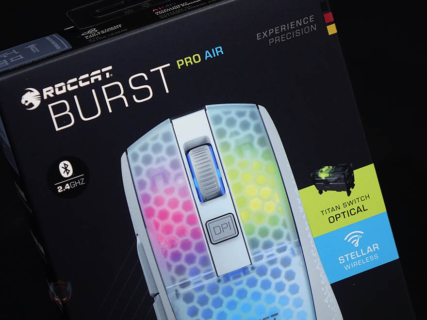 제품팩키지부터 살펴보면, 팩키지는 박스형으로 전면에는 제품 풀-샷 이미지를 담고 있는데, 이미 유선버전으로 나왔던 BURST Pro 모델에 대해서 알고 있는 소비지라면, 한눈에 봐도 디자인에는 큰 변화가 없다라는 것을 알 수 있습니다. 그리고, 모델명과 함께 오른쪽에 독일 상징의 국가 컬러가 표시되어있는데, 로켓이 이제 미국의 게이밍 브랜드 터틀비치에 인수되었다고하지만, 그래도 로켓하면 여전히 독일의 대표적인 게이밍브랜드로 상징하기때문에 표시되어 있습니다. 물론, 터틀비치 역시 미국의 대표적인 게이밍 기어브랜드로 국내외 프로게이머/스트리머들과 협업해 마우스, 헤드셋 등 다양한 제품을 선보이는걸로 유명하고, 한국에서는 젠지 이스포츠(Gen.G Esports)팀과도 파트너쉽을 맺고 있기도 합니다. 이 외에도 박스 전면에는 2.4GHz 무선 표시와 로켓의 타이탄 스위치, 스텔라(Stellar) 무선을 표기하고 있는데, 쉽게 말해 2.4GHz와 블루투스 2가지 모두 지원을 의마합니다. 참고로, 블루투스는 최신 5.2버전을 지원합니다.