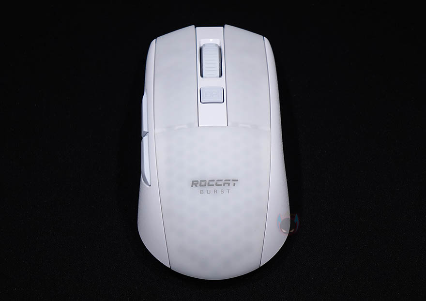 그럼, 로켓 BURST Pro Air 무선 게이밍 마우스를 본격적으로 살펴보면, 디자인은 앞서 언급했듯이 유선버전 BURST Pro에서 크게 벗어나지 않습니다. 거의 동일한 디자인을 가지고 있으며, 좌우대칭이지만 왼쪽 측면에 추가버튼이 적용되어 있기때문에 유선버전과 마찬가지로 오른손잡이 마우스입니다. 참고로 색상은 블랙과 화이트 2가지로 출시되었으며, 손바닥과 맞닿는 팜-레스트부분에는 로켓 로고와 함께 유선버전과 마찬가지로 반투명처리를 해서 내부에 벌집모양의 바이오닉 쉘 구조를 간접적으로 볼 수 있습니다. 물론, 반투명처리는 앞부분 기본 좌우버튼까지 그대로 이어지는 형태이며, 이전 유선버전과 달리 이번 무선버전에서 디자인이 좀 더 나아진 부분도 있는데 바로, 휠버튼/DPI버튼 구간의 주변 색상도 마우스 전체색상과 그대로 통일시켰습니다. 유선버전에선 화이트색상모델 이부분이 블랙색상으로 처리되어있죠. 그리고, 반투명된 부분들은 유선때와 마찬가지로 뒤에서 확인하겠지만, RGB 조명효과를 볼 수 있는 구간입니다.