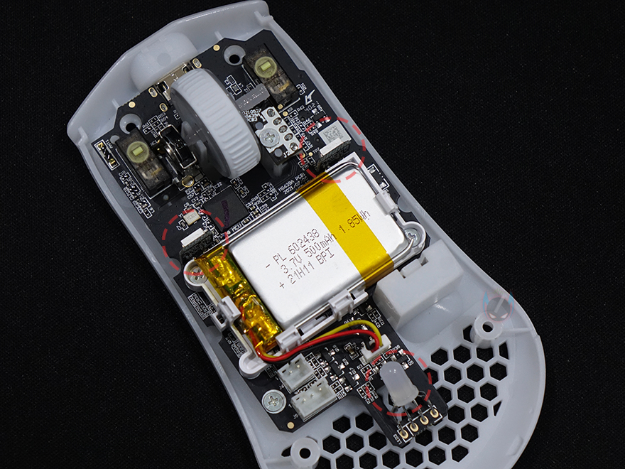 로켓 BURST Pro Air 무선 게이밍 마우스 내부를 잠깐 살펴보면, 상단커버 안쪽에는 앞서 외부에서 간접적으로 확인한 벌집모양의 바이오닉 쉘 디자인과 함께 기본 좌우버튼 클릭 정확성을 위해 ㅁ자형으로 처리된 지렛대를 확인할 수 있으며, PCB기판에는 총 3개의 LED가 적용되어있으며, 내장 배터리용량은 500mAh입니다. 그리고, 기본 좌우버튼 스위치는 1억 클릭수명의 로켓 타이탄(Titan) 광 스위치, 센서는 로켓 오울-아이 센서라고 언급하지만, 정확히는 PixArt사의 PAW3370을 로켓만의 스타일로 변형한 센서입니다. 그래서, DPI는 최대 19,000DPI까지 지원하죠.