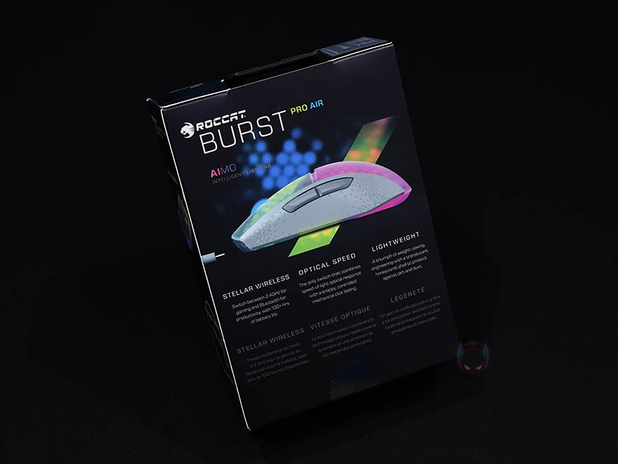 또한, 박스 측면에는 유선버전과 동일하게 열처리된 PTFE 글라이드 적용과 무선 버전에서 바뀐 충전케이블, 무게, 클릭수명, RGB 조명, 로켓 오울-아이 센서의 19,000 DPI 표기를 확인할 수 있습니다. 그리고, 국내에 정식출시된 제품은 국내 수입사인 민트탭스(mintteps)의 정품 스티커도 확인할 수 있죠. 박스 후면에는 로켓의 RGB 조명 AIMO 조명 연출이미지와 함께 무선/속도/무게에 대한 추가 언급을 표기하고 있습니다. 박스를 열어보면, 제품포장은 투명-캡 방식으로 제품이 흔들리지 않게 포장되어 있으며, 제품구성은 BURST Pro Air 게이밍 마우스, 2.4GHz 무선 동글이, 충전케이블, 제품설명서로 이루어져 있습니다.