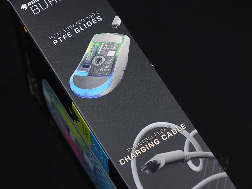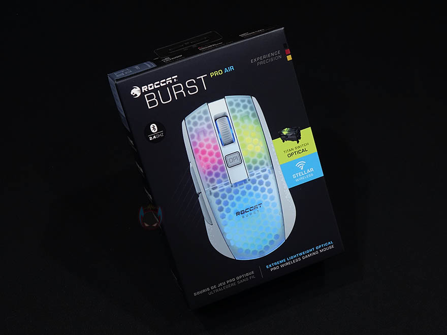 제품팩키지부터 살펴보면, 팩키지는 박스형으로 전면에는 제품 풀-샷 이미지를 담고 있는데, 이미 유선버전으로 나왔던 BURST Pro 모델에 대해서 알고 있는 소비지라면, 한눈에 봐도 디자인에는 큰 변화가 없다라는 것을 알 수 있습니다. 그리고, 모델명과 함께 오른쪽에 독일 상징의 국가 컬러가 표시되어있는데, 로켓이 이제 미국의 게이밍 브랜드 터틀비치에 인수되었다고하지만, 그래도 로켓하면 여전히 독일의 대표적인 게이밍브랜드로 상징하기때문에 표시되어 있습니다. 물론, 터틀비치 역시 미국의 대표적인 게이밍 기어브랜드로 국내외 프로게이머/스트리머들과 협업해 마우스, 헤드셋 등 다양한 제품을 선보이는걸로 유명하고, 한국에서는 젠지 이스포츠(Gen.G Esports)팀과도 파트너쉽을 맺고 있기도 합니다. 이 외에도 박스 전면에는 2.4GHz 무선 표시와 로켓의 타이탄 스위치, 스텔라(Stellar) 무선을 표기하고 있는데, 쉽게 말해 2.4GHz와 블루투스 2가지 모두 지원을 의마합니다. 참고로, 블루투스는 최신 5.2버전을 지원합니다.