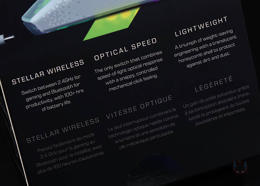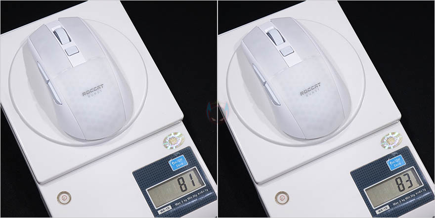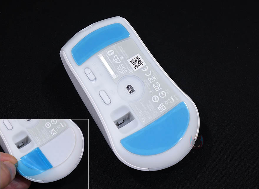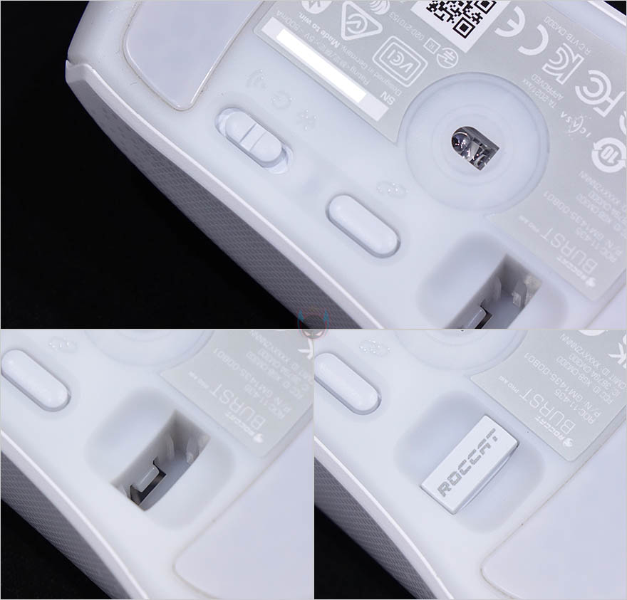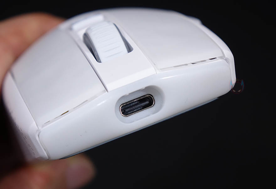 마우스 측면 역시 유선버전과 동일하게 벌집모양의 엠보싱 일정패턴 디자인을 처리해놨으며, 전면에는 충전케이블과 연결되는 USB Type-C포트가 적용되어 있습니다. 마우스 밑바닥도 테프론-피트는 유선버전과 동일하게 열처리된 순수 PTFE 글라이드이며, 개봉시에는 보호비닐이 부착되어 있기때문에 사용시에는 보호비닐을 제거해야합니다. 그리고, 가운데 광-센서 위치기준으로 왼쪽에는 2.4GHz 무선/전원Off/블루투스 모드로 선택할 수 있는 스위치와 바로 아래에 프로파일 전환버튼이 배치되어 있는데, 온보드 방식의 프로파일로 최대 5개를 지원합니다. 또한, 프로파일 전환버튼 아래에는 2.4GHz 무선 동글이를 수납할 수 있는 수납함도 적용되어 있죠. 참고로, 마우스 자체의 무게는 81g이고, 2.4GHz 무선 동글이를 수납한 상태의 무게는 83g입니다.