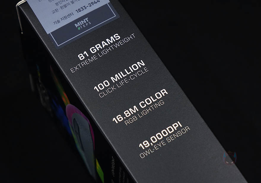 또한, 박스 측면에는 유선버전과 동일하게 열처리된 PTFE 글라이드 적용과 무선 버전에서 바뀐 충전케이블, 무게, 클릭수명, RGB 조명, 로켓 오울-아이 센서의 19,000 DPI 표기를 확인할 수 있습니다. 그리고, 국내에 정식출시된 제품은 국내 수입사인 민트탭스(mintteps)의 정품 스티커도 확인할 수 있죠. 박스 후면에는 로켓의 RGB 조명 AIMO 조명 연출이미지와 함께 무선/속도/무게에 대한 추가 언급을 표기하고 있습니다. 박스를 열어보면, 제품포장은 투명-캡 방식으로 제품이 흔들리지 않게 포장되어 있으며, 제품구성은 BURST Pro Air 게이밍 마우스, 2.4GHz 무선 동글이, 충전케이블, 제품설명서로 이루어져 있습니다.