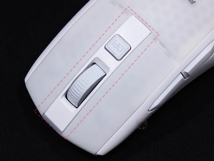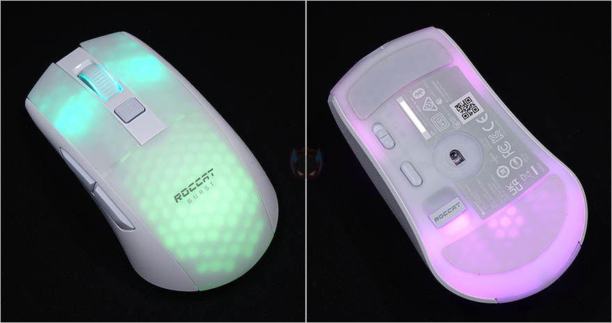 그럼, 로켓 BURST Pro Air 무선 게이밍 마우스를 본격적으로 살펴보면, 디자인은 앞서 언급했듯이 유선버전 BURST Pro에서 크게 벗어나지 않습니다. 거의 동일한 디자인을 가지고 있으며, 좌우대칭이지만 왼쪽 측면에 추가버튼이 적용되어 있기때문에 유선버전과 마찬가지로 오른손잡이 마우스입니다. 참고로 색상은 블랙과 화이트 2가지로 출시되었으며, 손바닥과 맞닿는 팜-레스트부분에는 로켓 로고와 함께 유선버전과 마찬가지로 반투명처리를 해서 내부에 벌집모양의 바이오닉 쉘 구조를 간접적으로 볼 수 있습니다. 물론, 반투명처리는 앞부분 기본 좌우버튼까지 그대로 이어지는 형태이며, 이전 유선버전과 달리 이번 무선버전에서 디자인이 좀 더 나아진 부분도 있는데 바로, 휠버튼/DPI버튼 구간의 주변 색상도 마우스 전체색상과 그대로 통일시켰습니다. 유선버전에선 화이트색상모델 이부분이 블랙색상으로 처리되어있죠. 그리고, 반투명된 부분들은 유선때와 마찬가지로 뒤에서 확인하겠지만, RGB 조명효과를 볼 수 있는 구간입니다.