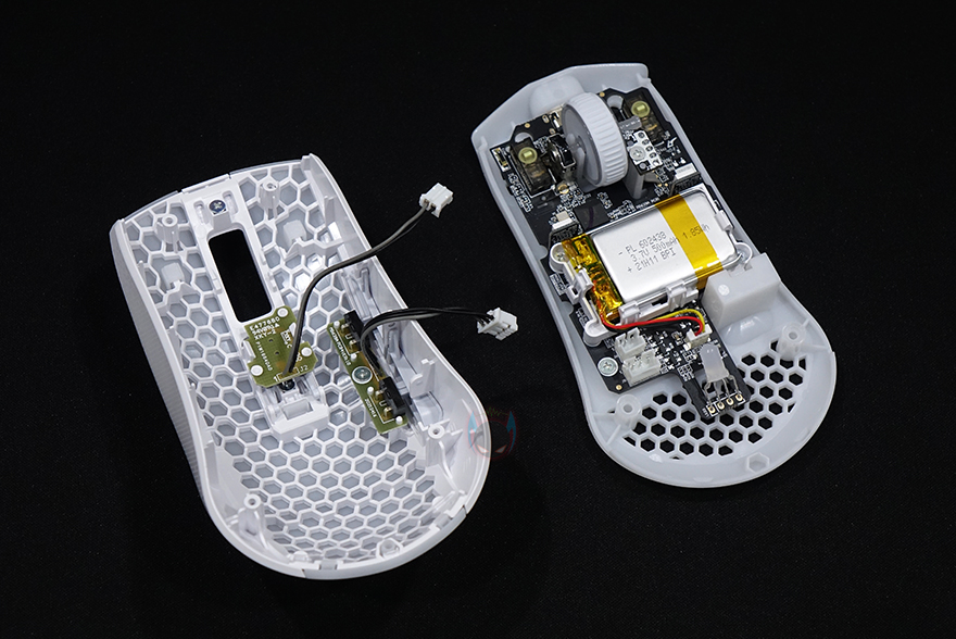로켓 BURST Pro Air 무선 게이밍 마우스 내부를 잠깐 살펴보면, 상단커버 안쪽에는 앞서 외부에서 간접적으로 확인한 벌집모양의 바이오닉 쉘 디자인과 함께 기본 좌우버튼 클릭 정확성을 위해 ㅁ자형으로 처리된 지렛대를 확인할 수 있으며, PCB기판에는 총 3개의 LED가 적용되어있으며, 내장 배터리용량은 500mAh입니다. 그리고, 기본 좌우버튼 스위치는 1억 클릭수명의 로켓 타이탄(Titan) 광 스위치, 센서는 로켓 오울-아이 센서라고 언급하지만, 정확히는 PixArt사의 PAW3370을 로켓만의 스타일로 변형한 센서입니다. 그래서, DPI는 최대 19,000DPI까지 지원하죠.