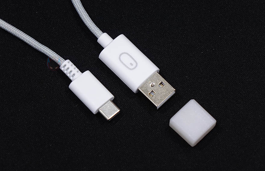 끝으로, 충전케이블은 슬리빙처리된 유여한 PhantomFlex 충전케이블로 길이는 1.8m이며, 마우스와 연결되는 인터페이스는 USB Type-C 형태이며, 충전기와 연결되는 인터페이스는 USB Type-A 형태입니다. 또한, USB Type-A는 사용하지 않을 시 먼지 유입방지를 위해 보호마개도 제공을 해주고 있는데, 기왕이면 USB Type-C쪽도 제공해주었으면 더 좋지 않았을까 생각합니다.