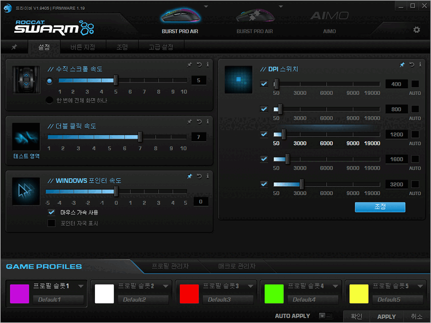 요즘 대부분의 주변기기들은 소프트웨어 제공을 해주고 있죠. 로켓 역시 예전부터 자사 주변기기 제품들에 소프트웨어 제공으로 유명했는데, BURST Pro Air 무선 게이밍 마우스 역시 로켓의 대표적인 공용 소프트웨어 'ROCCAT SWARM'을 통해 다양한 기능들을 설정 사용할 수 있습니다. 프로그램을 설치해서 실행해보면, 메뉴는 크게 설정/버튼지정/조명/고급설정으로 나뉘어지고, 프로파일(프로필슬롯) 5개 지원과 매크로 지원도 해줍니다. 설정메뉴는 기본적인 마우스 설정 그러니깐 스크롤/클릭/포인트속도조절 및 DPI 버튼의 설정값을 조정할 수 있는데, DPI 버튼은 총 5단계 전환으로 앞서 내부에서 확인했듯이, PAW3370기반 변형 오울-아이 센서를 사용했기때문에 최대 19,000DPI까지 지원하며, 50단위씩 값을 변경할 수 있습니다. 그리고, 버튼지정은 다른 마우스들처럼 버튼 기능설정을 사용자가할 수 있는데, 단 기본 좌우버튼은 고정기능이기때문에 이를 제외한 측면, 휠, DPI버튼을 설정할 수 있습니다. 조명은 RGB 조명설정부분으로 로켓의 지능형 조명효과 AIMO를 비롯해 파도/최대조명/박동/호흡/깜빡임/배터리상태의 조명모드로 변경할 수 있으며, 고급설정은 전송제어속도, 스내핑, 배터리상태, 초기화 등을 할 수 있습니다. 또한, 프로그램을 통해 마우스의 펌웨어 업데이트도 할 수 있는데, 참고로, 이때는 충전케이블을 사용해서 유선연결상태에서 업데이트를 해야합니다.