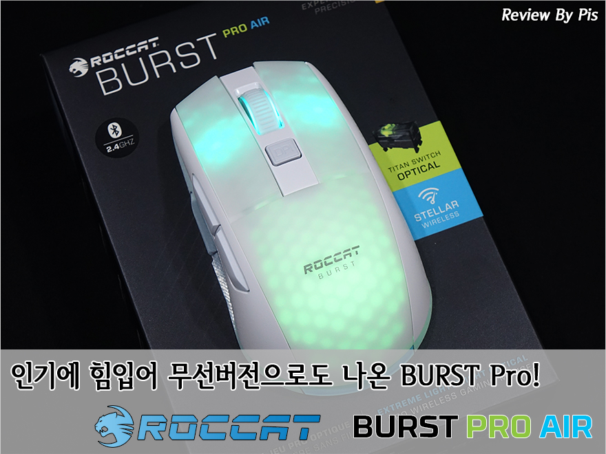 예전만하더라도 주변기기에 무선이 적용된 제품이라면 대부분 사무용 키보드와 마우스 혹은 노트북용이었죠. 하지만, 이제 주변기기 시장이 게이밍컨셉으로 자리잡으면서 게이밍 키보드와 마우스 제품에서도 무선 제품을 어렵지 않게 찾아볼 수 있죠. 특히, 마우스는 키보드처럼 고정위치가 아닌 사용자 손의 움직임에 따라 유동적 위치이기때문에 무선이 적용된다라는 것은 케이블 제한에서 벗어나기때문에 그만큼 저 자유로워집니다. 그래서, 최근 소비자들이 게이밍 마우스를 선택할때도 확실히 예전보다 무선 게이밍 마우스를 많이 선택하고 있죠. 독일의 대표적인 게이밍 주변기기 브랜드 로켓(ROCCAT) 역시 작년에 초경량 게이밍 마우스로 인기를 얻었던 유선마우스 BURST Pro 모델에 무선 버전을 출시했는데, 바로 BURST Pro Air 입니다. 그럼, 로켓의 무선 게이밍 마우스 BURST Pro Air를 만나보도록 하겠습니다.