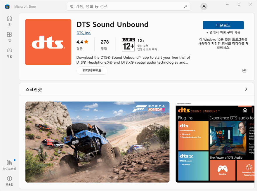 직접, 하이퍼엑스 클라우드 코어 무선 게이밍 헤드셋을 사용해보면, 무선 방식은 2.4GHz 동글이 방식이기때문에, 제공되는 동글이를 PC나 노트북 USB포트에 꽂은 후 헤드셋의 전원버튼을 2초이상 누르면 켜지면서, 잠깐동안 녹색 LED가 깜빡이면서 자동으로 연결이 됩니다. 기존의 하이퍼엑스 무선 게이밍 헤드셋 제품들과 동일한 방식이기때문에 연결에 어려움은 없으며, 헤드셋 배터리관리를 위해 20분간 오디오 재생이 없으면 헤드셋 전원이 Off되며, 동글이가 연결되지 않은 상태라면 3분 후에 전원이 자동 Off 됩니다. 그리고, 앞서 잠깐 언급했듯이, 이번 클라우드 코어 무선 게이밍 헤드셋은 유선모델에서 지원하던 가상 7.1채널 사운드를 빼고, DTS Headphone:X 기술을 적용했습니다. 그래서, 앞서 설명서에서 참고했듯이, 마이크로소프트 스토어에서 관련 어플 'DTS Sound Unbound'를 다운로드 설치할 수 있죠.