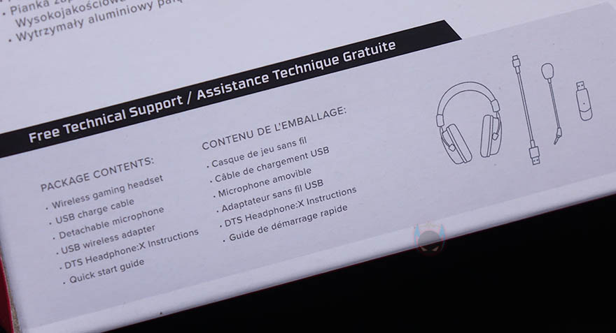 제품포장은 속박스와 함께 헤드셋은 포장처리가 되어있으며, 제품구성은 클라우드 코어 무선 게이밍 헤드셋, 분리형 마이크, 2.4GHz 무선 동글이, 충전케이블, 보증서, 제품설명서, DTS Headphone:X 설명서, 큐카드로 이루어져 있습니다. DTS Headphone:X 설명서는 어플 설치에 관한 내용을 담고 있는데, 마이크로소프트 스토어에서 다운로드 받을 수 있으며, 이부분은 뒤에서 다시 자세히 언급하겠습니다.