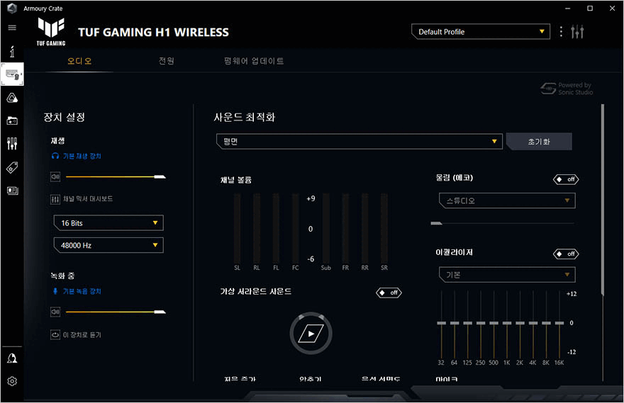 ASUS TUF Gaming H1 wireless 무선 게이밍 헤드셋을 PC에서 사용하면, 소프트웨어를 사용할 수 있는데, 바로, TUF Gaming 소프트웨어 'Armoury Crate' 입니다. 헤드셋 전원을 켠 상태에서 프로그램에서 장치 인식을 하면, 사운드 최적화부터 에코/이퀄라이저/가상 서라운드 사운드 On/Off, 채널 볼륨조절, 저음증가 등 다양한 기능들을 사용자에 취향에 맞춰 사운드 설정을 할 수 있습니다. 또한, 샘플레이트도 44100/48000Hz 중 선택할수도 있고, 사용자 설정의 프로파일 저장도 할 수 있으며, 배터리 상태, 펌웨어 업데이트도 지원을 해줍니다.