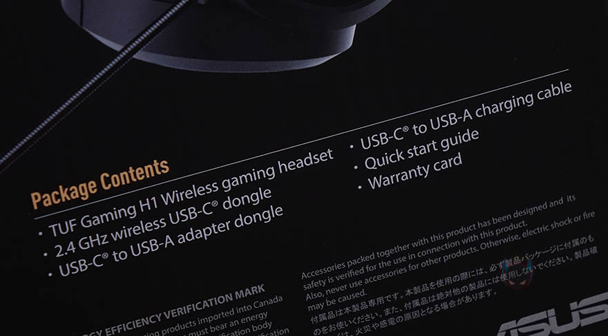 박스 후면에는 제품 풀샷 이미지와 함께 좀 더 자세히 제품 특징을 소개하고 있는데, 가벼워진 디자인, 음성채팅, 오디오 품질, 2.4GHz 무선 방식, 배터리, 다양한 플랫폼 지원을 언급하고 있습니다. 물론, 제품 구성목록도 확인할 수 있죠. 박스를 열어보면, 부속품들이 담기는 공간분배식으로 포장처리된 것을 확인할 수 있으며, 헤드셋은 별도의 포장이 한 번 더 되어있고, TUF Gaming H1 wireless 무선 게이밍 헤드셋, 2.4GHz 동글이, USB Type C to A 젠더, 충전케이블, 제품설명서, 보증서로 제품구성을 이루고 있습니다.