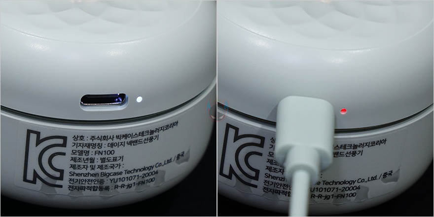 넥밴드 선풍기를 착용하면, 보통 선풍기에서 귀까지의 거리가 10cm 내외로 되는데, 데이지 넥 밴드를 10cm 거리를 두고 단계별로 소음측정을 해 본 결과, 1단계는 약 48dB, 2단계는 약 59dB, 3단계는 약 62dB로 소음은 발생하지만, 주변 대화는 충분히 들릴정도라 거슬리진 않겠습니다. 마지막으로, 작동시에는 충전포트 옆에 배치된 LED 인디케이터가 화이트 색상으로 점등되고, 충전시에는 레드 색상으로 점등됩니다.