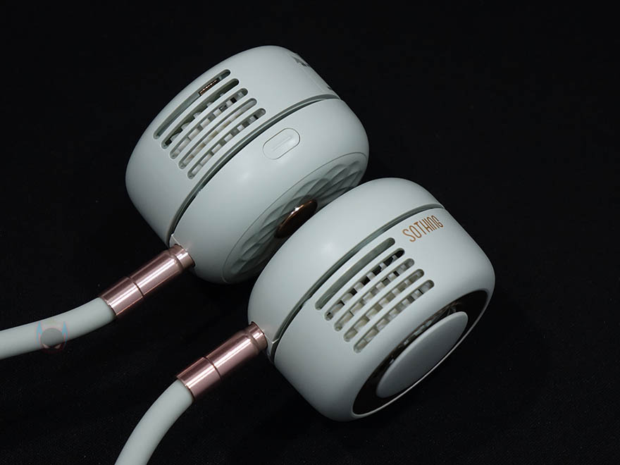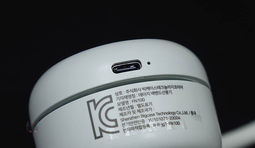 바람이 나오는 선풍기 부분은 원형 디자인으로 바깥쪽은 음각형태로 꽃모양의 디자인을 적용하고 있으며, 가운데 포인트로 브라운 메탈릭 색상을 적요하고 있는데, 선풍기와 케이블 연결부에도 포인트로 적용하고 있습니다. 일반적인 넥밴드 선풍기에선 좀처럼 보기드문 디자인이라 고급스러운 느낌이 있습니다. 그리고, 안쪽 흡입구부분도 브라운 메탈릭 색상을 적용하고 있으며, 바람이 나오는 측면 송풍구에는 반 폐쇄 설계로 이물질이 들어가지 않도록 했으며, 내부에는 60개 날개를 가진 블래드리스 터보-팬이 적용되어 있습니다. 또한, 선풍기 한쪽에는 버튼과 충전포트, LED 인디케이터가 적용되어 있죠. 버튼은 전원과 풍량조절 겸용으로 한 번씩 누를때마다 전원 On→1단계→2단계→3단계→전원 Off 순으로 작동됩니다. 그리고, 제공되는 충전케이블 역시 제품 색상과 맞춰서 동일하게 적용하고 있으며, USB 인터페이스는 Type-C to A로 적용되어 있습니다.