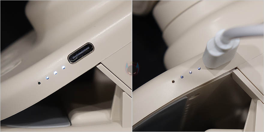이 외에도 집게 전면에는 버튼 2개가 배치되어 있는데, 왼쪽에는 좌우회전 버튼, 오른쪽에는 전원/풍량조절 버튼으로 풍량조절은 앞서 제품박스에서 확인했듯이 3단계 조절로 버튼을 한 번씩 누를 때마다 전원 On→1단계→2단계→3단계→전원 Off 순으로 작동됩니다. 그리고, 집게 오른쪽 측면에는 충전케이블과 연결되는 USB Type-C 포트가 적용되어 있으며, 포트 바로 앞쪽에는 배터리 상태를 확인할 수 있는 LED 인디케이터도 적용되어 있죠. 또한, 이번 제품이 기본 컨셉은 클립형 선풍기지만, 집게 밑바닥부분에도 미끄럼방지 실리콘패드가 부착된 것을 확인할 수 있어서, 그냥 바닥에 놓고 사용할수도 있습니다. 쉽게말해, 탁상용 겸용인거죠. 물론, 사용전에 부착된 보호비닐은 제거해야합니다.