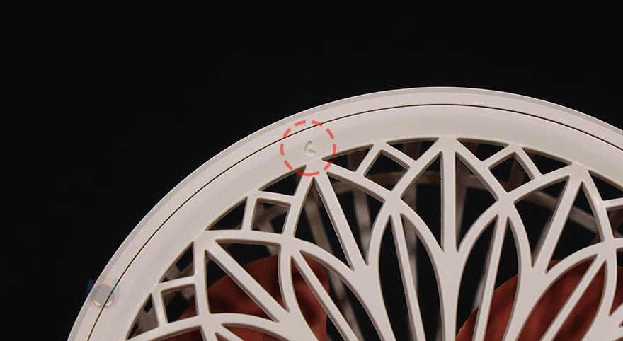 선풍기 부분은 앞서 제품박스에서 언급했듯이 이 제품의 이름에 왜 '썬플라워'라는 명칭이 붙었는지 알 수 있는 그릴 디자인이 가장 먼저 눈에 들어오는데, 바로 꽃 모양에서 모티브를 얻은 디자인을 적용하고 있기때문이죠. 이번에 소싱에서 출시한 대부분의 신제품 휴대용 선풍기들이 이런 그릴 디자인을 적용하고 있습니다. 그리고, 그릴 윗부분에 표시된 시계 반대방향으로 그릴을 돌리면 쉽게 분리도 가능해, 청소도 수월하게 할 수 있죠. 날개는 3엽 날개입니다.