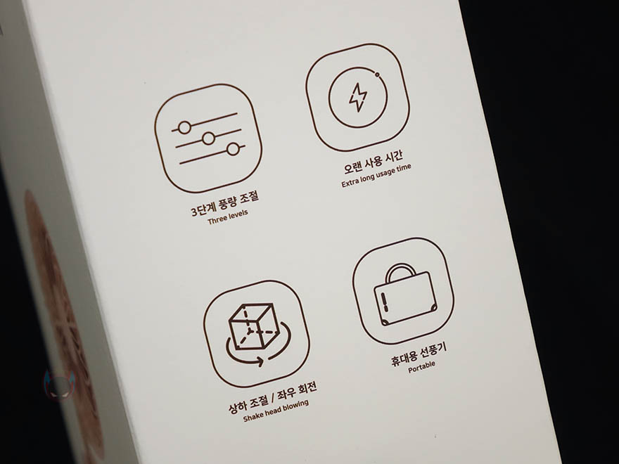 이 밖에도 박스 후면에는 제품의 기본 사양을 표기해놨는데, 색상, 배터리용량, 사용시간, 무게 등 상세하게 표기해놨기때문에 구입전 충분한 정보를 얻을 수 있으며, 썬플라워 클립형 선풍기는 기본적으로 비닐포장으로 처리되어있고, 본 제품인 선풍기를 비롯해, 충전케이블, 제품설명서로 제품구성을 이루고 있습니다.