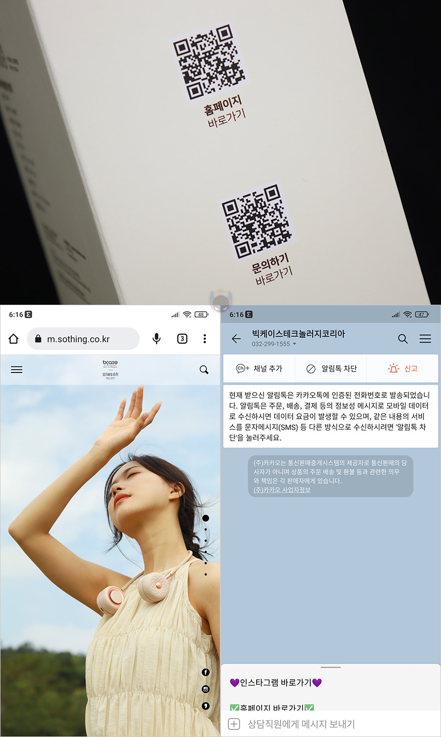 제품박스부터 살펴보면, 전면에는 제품 이름과 함께 제품 디자인그림을 담고 있는데, 한눈에 봐도 왜 제품 이름에 '썬플라워'라는 명칭이 붙었는지 짐작할 수 있습니다. 그리고, 작년 브랜드대상 수상표시도 확인할 수 있어서, 점점 소싱의 위상이 높아졌다라는것도 알 수 있습니다. 박스 측면에는 제품의 주요 특징으로 3단계 풍량조절, 긴 사용시간, 상하조절/좌우회전, 휴대용 선풍기라고 명시되어 있으며, 또다른 측면에는 소싱 정식수입사인 (주)빅케이스테크놀러지코리아 홈페이지로 연결되는 QR코드와 문의를 할 수 있는 QR코드를 표시해놨습니다. 참고로, 문의하기는 카카오 메신저로 연결되며, 메신저로 들어가면 소싱 공식 SNS 인스타그램(https://www.instagram.com/sothing_official/)으로도 쉽게 접속할 수 있습니다.