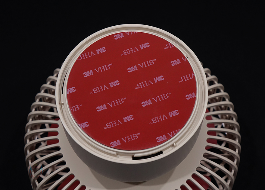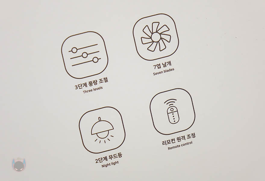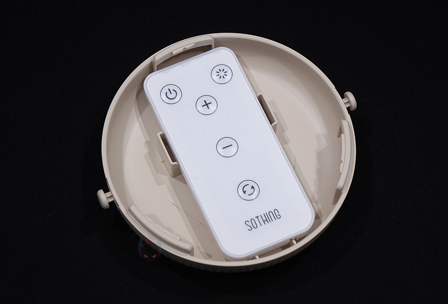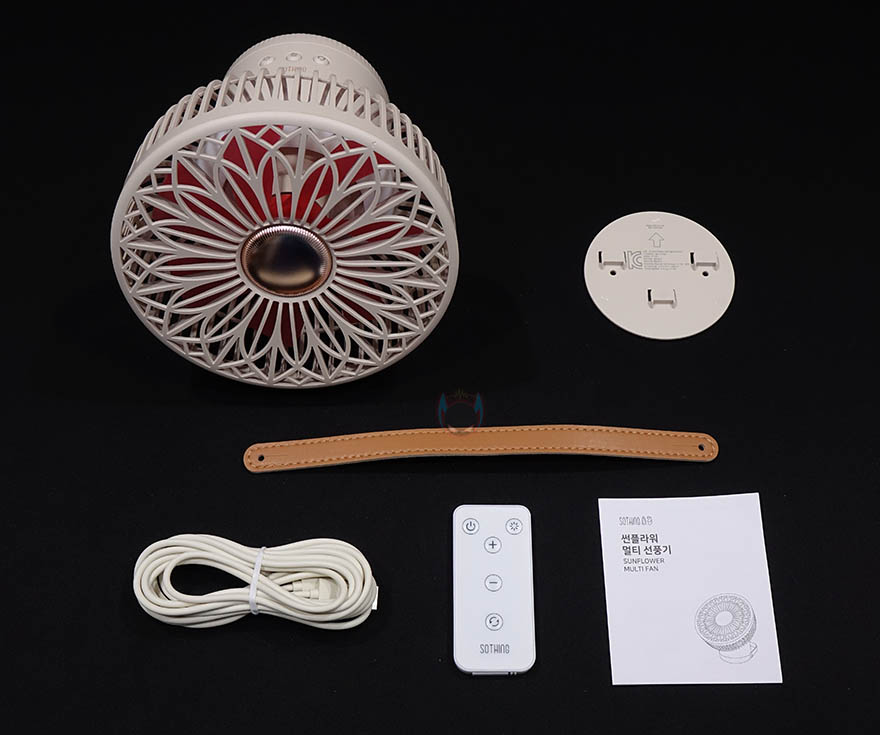 스탠드 후면에는 타프형, 탁상형, 벽걸이형 사용법과 함께 후면 덮개를 시계 방향으로 돌리면 열 수 있는데, 덮개를 열면 덮개 안쪽에 리모컨을 수납할 수 있습니다. 또한, 앞서 구성품에서 본 가죽 재질의 스트랩은 스탠드 양쪽에 걸어서 타프형으로 사용할 수 있게 해주고, 벽걸이에 사용되는 브라켓은 후면에 접착 테이프가 부착되어 있습니다. 방법은 간단하게 브라켓을 먼저 벽에 붙이고, 스탠드 후면 덮개를 벗긴 후에 브라켓에 끼우는 방식입니다. 후면 덮개에 부착된 사용법을 참고하면 쉽게 이해하고 장착할 수 있습니다. 그리고, 원격조정할 수 있게 제공되는 리모컨에는 전원, 무드등 밝기조절, 풍량조절, 좌우회전 기능버튼이 적용되어 있으며, 기본적으로 배터리도 포함되어 있기때문에, 사용시에는 배터리 삽입구에 끼워진 방지-탭을 빼내야합니다. 배터리는 CR2025 수은전지가 사용됩니다. 끝으로, 충전케이블은 총 3m의 길이를 가졌으며, USB Type-C to A 인터페이스를 가졌습니다. 충전케이블이 긴 이유는 본 제품이 다용도로 사용되기 때문이죠.