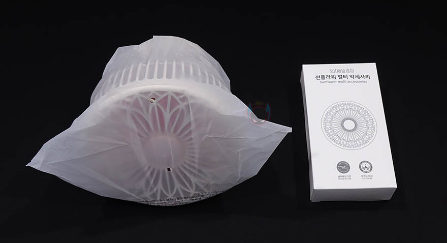 박스 후면에는 제품의 기본 사양을 표기해놨는데, 배터리용량, 충전시간, 사용시간, 무게 등 상세하게 표기해놨기때문에, 구입 전 도움이 되겠습니다. 박스를 열어보면, 제품 포장은 썬플라워 멀티 선풍기는 비닐포장, 부속품들은 분실이 되지않게 별도의 박스포장으로 되어 있으며, 제품 구성은 썬플라워 멀티 선풍기, 벽걸이 브라켓, 스트랩, 충전케이블, 리모컨, 제품설명서로 이루고 있습니다.