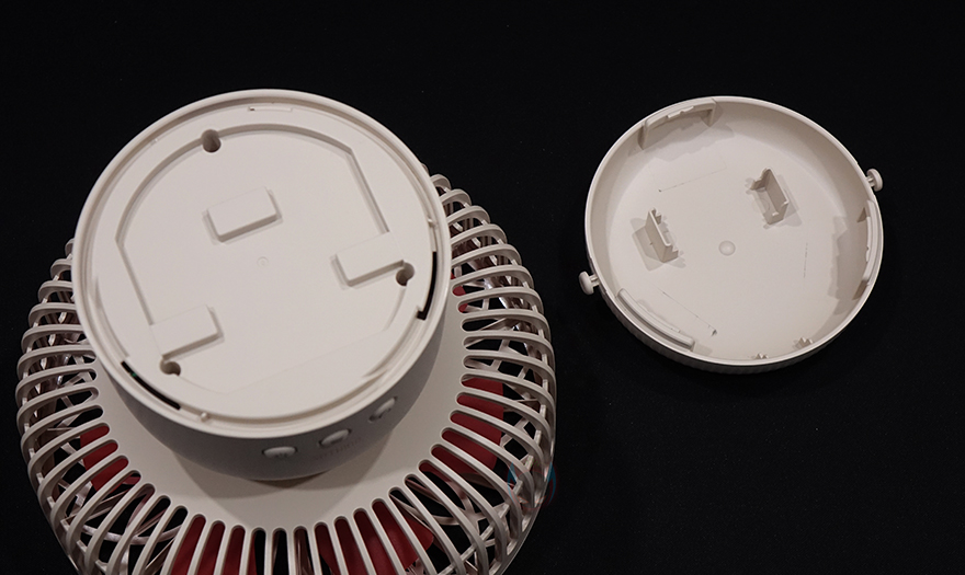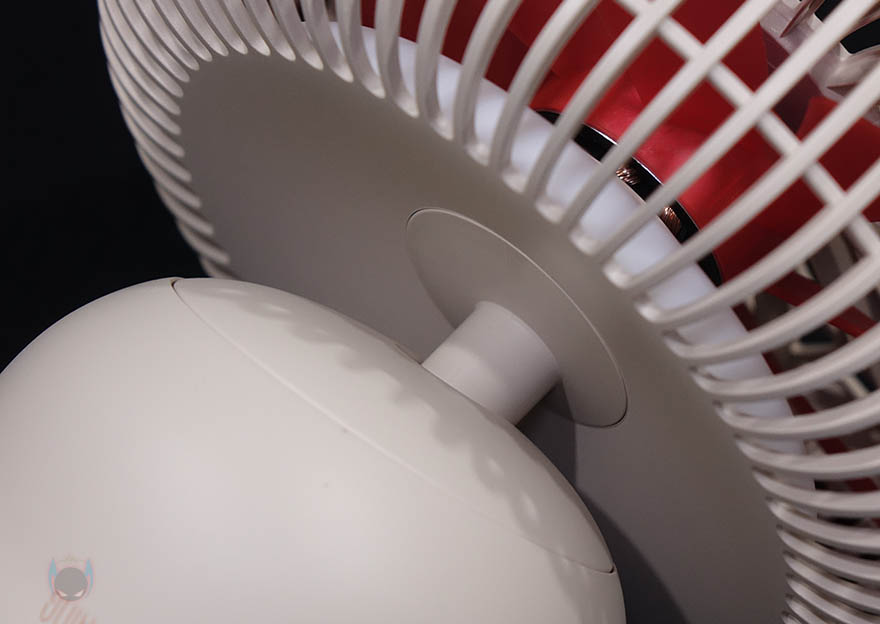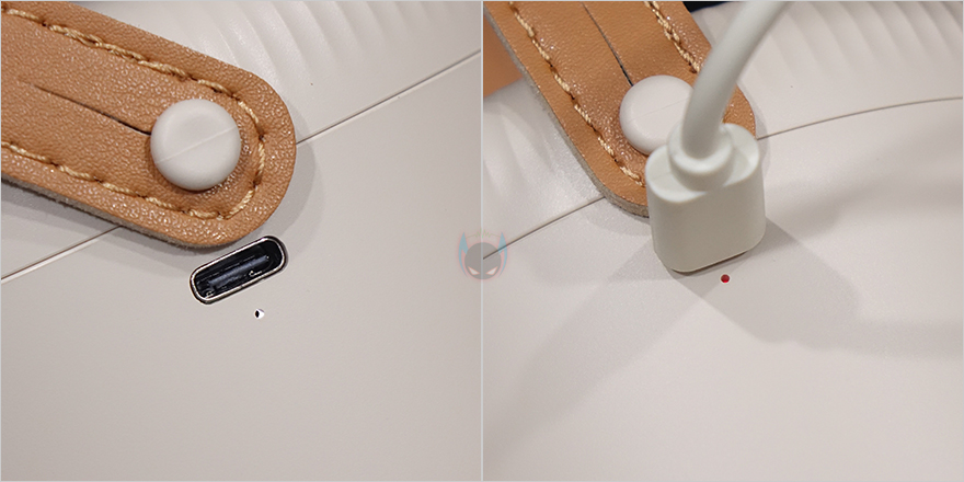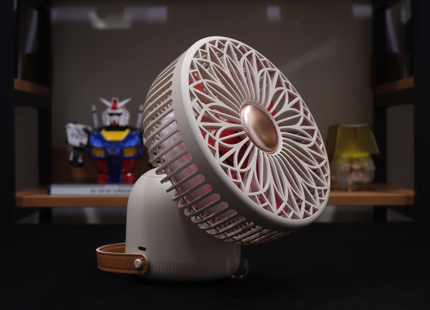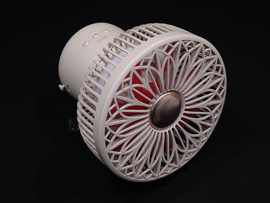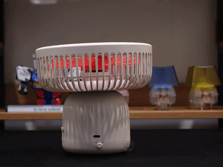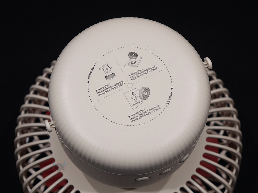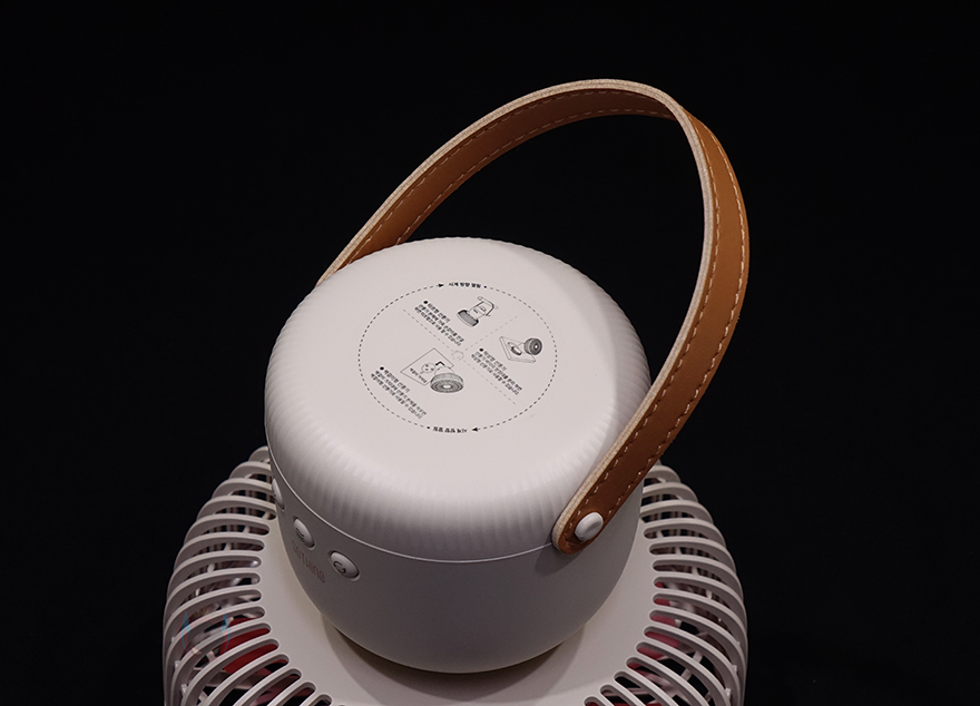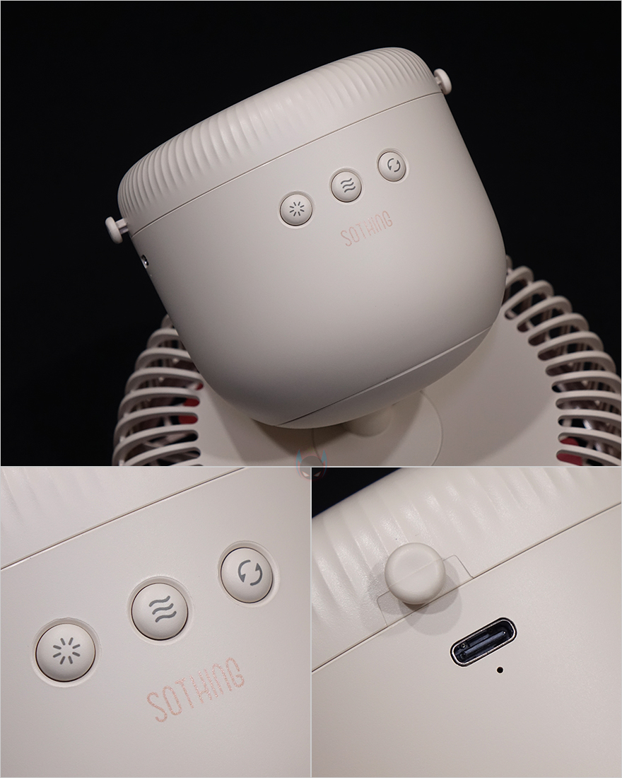 그리고, 선풍기 후면에는 스탠드와 연결되는 목부분이 있는데, 이 목부분은 총 5단계로 60˚ 상하 각도조절을 할 수 있습니다. 그래서, 스탠드, 벽걸이, 타프형 어떤 용도로도 사용할 수 있는거죠. 또한, 각도조절 후에는 좌우 회전도 가능한데, 이 기능은 스탠드에 배치된 버튼에서 바로 확인이 되죠. 스탠드에는 총 3개의 버튼이 적용되어 있는데, 가운데 전원/풍량조절 버튼, 양쪽에 각각 무드등 조절버튼과 좌우회전 버튼입니다. 뒤에서 확인하겠지만, 전원버튼은 이번에 다른 신제품들과 마찬가지로 한 번씩 누를 때마다 전원 On→1단계→2단계→3단계→전원 Off 순으로 작동되며, 무드등은 2단계로 밝기 조절됩니다. 그리고, 스탠드 측면에는 충전케이블과 연결되는 USB Type-C 포트가 적용되어 있으며, 바로 아래에 작동/충전상태를 확인할 수 있는 LED 인디케이터가 적용되어 있습니다.