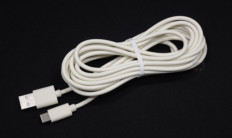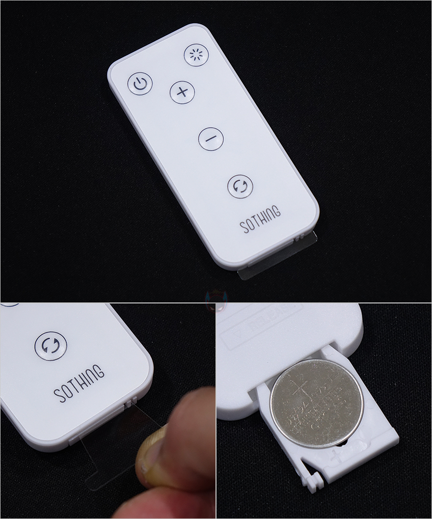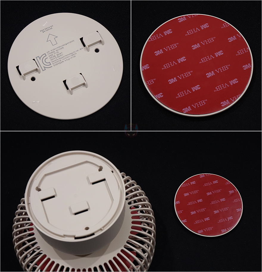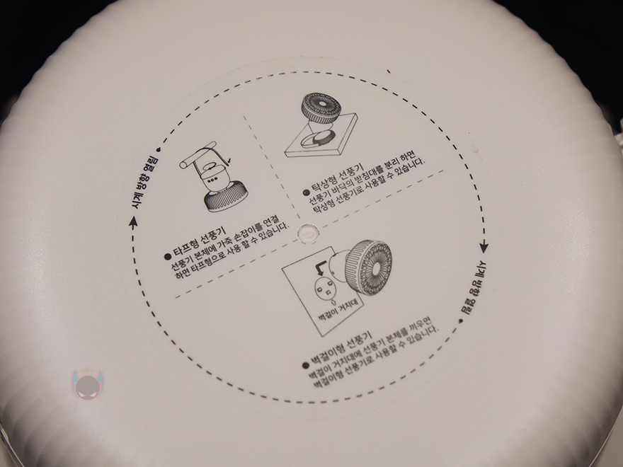 스탠드 후면에는 타프형, 탁상형, 벽걸이형 사용법과 함께 후면 덮개를 시계 방향으로 돌리면 열 수 있는데, 덮개를 열면 덮개 안쪽에 리모컨을 수납할 수 있습니다. 또한, 앞서 구성품에서 본 가죽 재질의 스트랩은 스탠드 양쪽에 걸어서 타프형으로 사용할 수 있게 해주고, 벽걸이에 사용되는 브라켓은 후면에 접착 테이프가 부착되어 있습니다. 방법은 간단하게 브라켓을 먼저 벽에 붙이고, 스탠드 후면 덮개를 벗긴 후에 브라켓에 끼우는 방식입니다. 후면 덮개에 부착된 사용법을 참고하면 쉽게 이해하고 장착할 수 있습니다. 그리고, 원격조정할 수 있게 제공되는 리모컨에는 전원, 무드등 밝기조절, 풍량조절, 좌우회전 기능버튼이 적용되어 있으며, 기본적으로 배터리도 포함되어 있기때문에, 사용시에는 배터리 삽입구에 끼워진 방지-탭을 빼내야합니다. 배터리는 CR2025 수은전지가 사용됩니다. 끝으로, 충전케이블은 총 3m의 길이를 가졌으며, USB Type-C to A 인터페이스를 가졌습니다. 충전케이블이 긴 이유는 본 제품이 다용도로 사용되기 때문이죠.