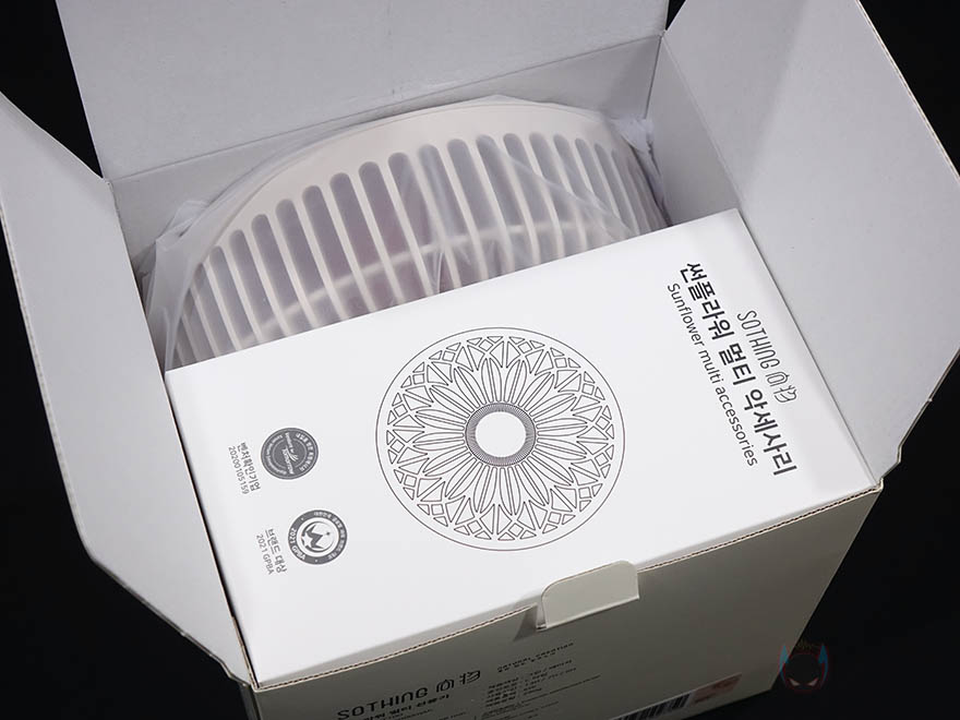 박스 후면에는 제품의 기본 사양을 표기해놨는데, 배터리용량, 충전시간, 사용시간, 무게 등 상세하게 표기해놨기때문에, 구입 전 도움이 되겠습니다. 박스를 열어보면, 제품 포장은 썬플라워 멀티 선풍기는 비닐포장, 부속품들은 분실이 되지않게 별도의 박스포장으로 되어 있으며, 제품 구성은 썬플라워 멀티 선풍기, 벽걸이 브라켓, 스트랩, 충전케이블, 리모컨, 제품설명서로 이루고 있습니다.