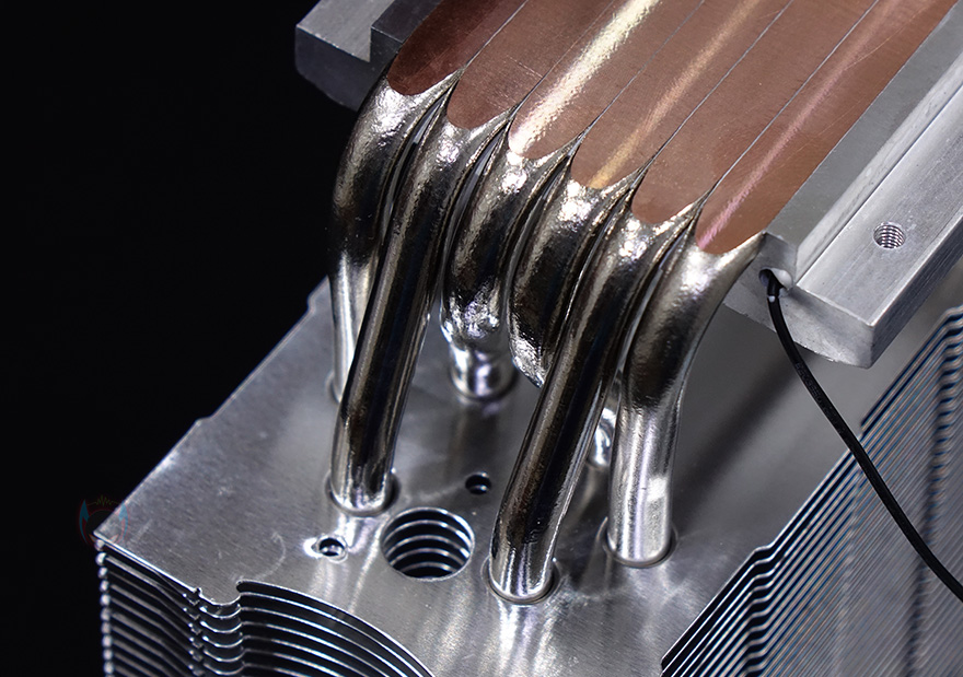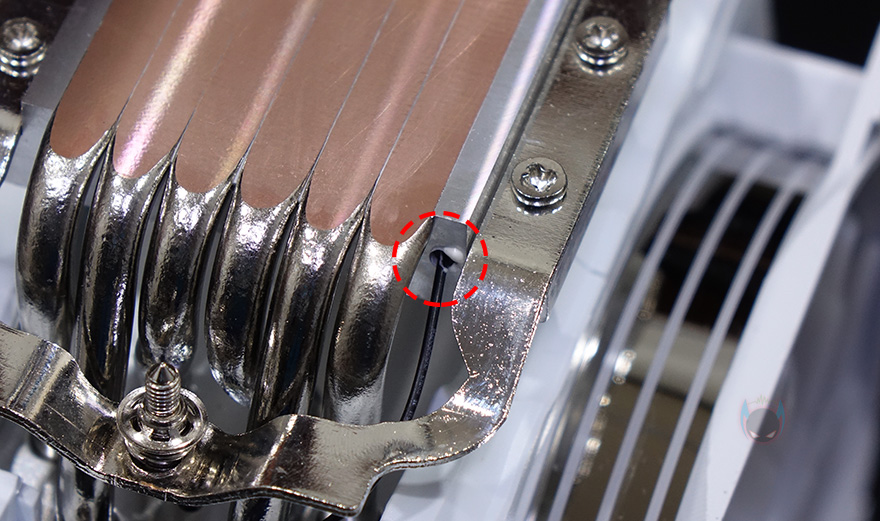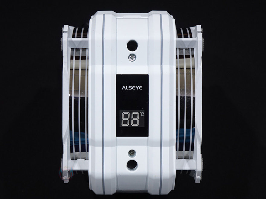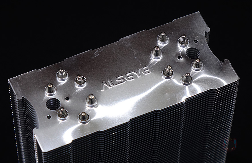 M120D Plus 쿨러는 팬 장착과 함께 커버 디자인을 적용하고 있는데, 쿨러 상단을 덮고 있는 커버에는 중앙에 블랙색상의 커버가 있으며, 이를 제거하면 중앙에 알스아이(Alseye) 로고와 함께 온도표시계를 볼 수 있습니다. 그리고, 위/아래로 각각 구멍이 있는데, 이 구멍에는 제공되는 공구 드라이버를 이용해, 쿨러 하단에 기본 장착된 리테션의 나사를 체결할 때 사용됩니다. 그리고, 쿨러 하단의 CPU와 맞닿는 베이스는 히트파이프가 그대로 접촉되는 일명 DTH방식이며, 지름 6mm 히트파이프 6개가 사용되었습니다.