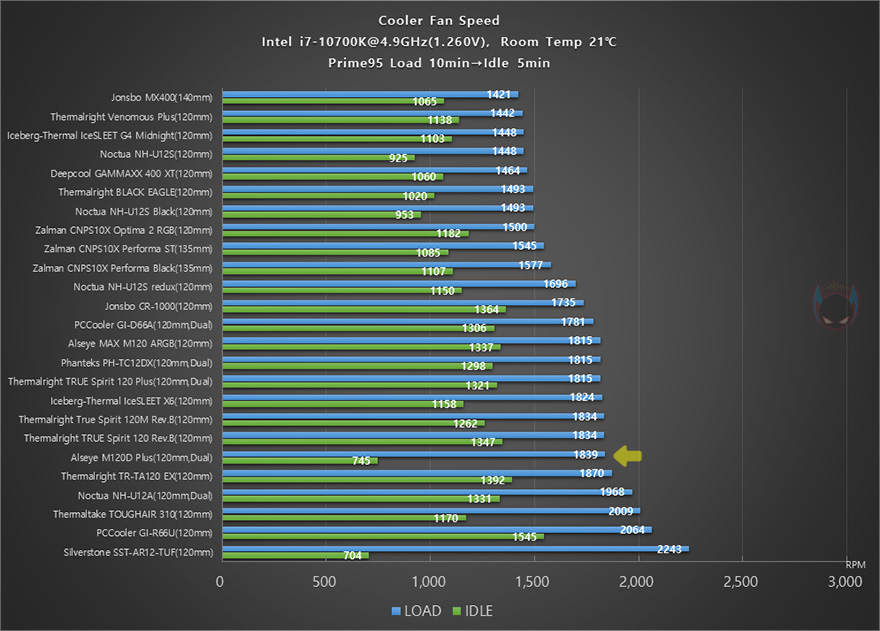 이번에 2차 오버클럭(4.9GHz) 상태에서 M120D Plus 쿨러의 쿨링성능을 확인해보면, 1차와 비슷하게 CPU온도는 전체 비교 쿨러들 중에서 상급에 속하는 결과를 보여줬으며, 역시 120mm 듀얼-팬 구성 쿨러 중에서는 3번째로 좋은 결과를 보여줬습니다. 메인보드 전원부 쿨링영향도 1차와 비슷하게 듀얼-팬 구성치고는 영향이 약한 편이죠. 그리고, Load상황과 Idle상황에서 각각 팬 속도와 소음도 측정해봤는데, 속도경우 Load에선 최대 속도에 근접한 모습을 보여주고, Idle에선 최소속도에 근접 작동되는걸 확인할 수 있습니다. 10cm 거리를 두고 측정한 소음 결과값은 듀얼팬 구성인점과 속도를 고려했을 때 정숙한 편이라 할 수 있습니다. 그래서, 전체적으로보면, 듀얼-팬 구성으로 CPU에 대한 쿨링성능은 만족스럽지만, 반대로 듀얼-팬 구성임에도 메인보드 전원부의 쿨링영향이 크지 않은 이유는 팬 위치의 영향이라 볼 수 있겠습니다.