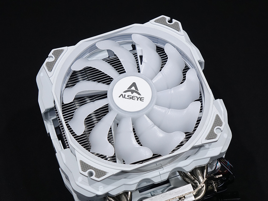 그럼, 본격적으로 알스아이(Alseye) M120D Plus 쿨러를 살펴보면, 시작에서도 잠깐 언급했지만, 블랙색상이 먼저 출시되었고, 최근에 화이트 색상이 출시되어서, 디자인은 블랙색상과 동일합니다. 일단, 전후면으로 120mm 팬이 각각 기본 장착되어 듀얼-팬을 구성하고 있죠. 팬 날개(블레이드)는 총 11개로 RGB조명효과를 위해 반투명으로 처리되어 있습니다.