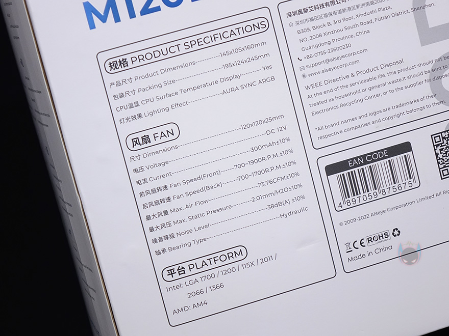 제품박스는 제품 색상에 맞춰 화이트 배경에 제품 이미지를 담고 있는데, 전면에는 모델명과 함께 쿨러의 상단부분으로 보여주고, 한쪽 측면은 쿨러 후면 이미지를 보여줍니다. 쉽게말해 그대로 이어지는 이미지인거죠. 반대쪽 측면에는 한국어를 포함해 주요 특징을 표기해놨는데, 설치, 쿨링효과, ARGB 지원, 듀얼팬&히트파이프, 소켓 지원을 언급합니다. 또한, 박스 후면에는 제품의 기본 사양표기로 항목은 한자로 표시해놨지만, 수치는 숫자이기때문에, 쿨러 크기, 팬 크기, 팬 속도, 소켓 지원 등을 상세하게 표기해놨다라는걸 알 수 있죠.