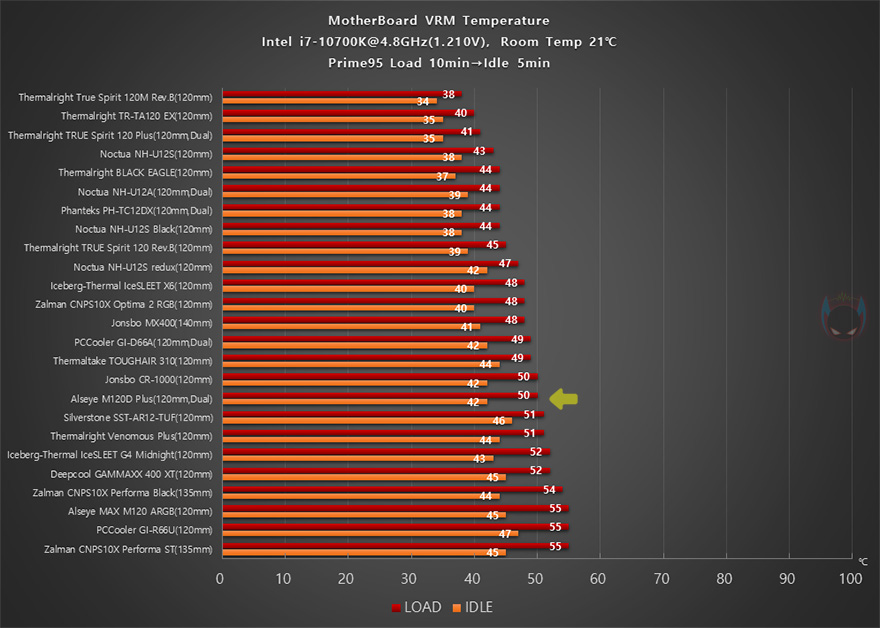 먼저, 1차 오버클럭(4.8GHz)에서 M120D Plus 쿨러의 쿨링성능을 확인해보면, 전체 비교쿨러들에서 상위급에 속하는 성능을 확인할 수 있는데, 120mm 듀얼-팬 구성의 쿨러 중에서는 두번째로 좋은 성능을 보여줬습니다. 특히, Idle보다는 Load에서 효과가 좀 더 나은 모습입니다. 반면에 메인보드 전원부에 대한 쿨링영향은 듀얼-팬 구성만큼 큰 효과를 주는 편은 아닙니다. 하지만, 오버클럭 테스트를 통과한만큼 충분히 영향은 주고 있다할수는 있죠.