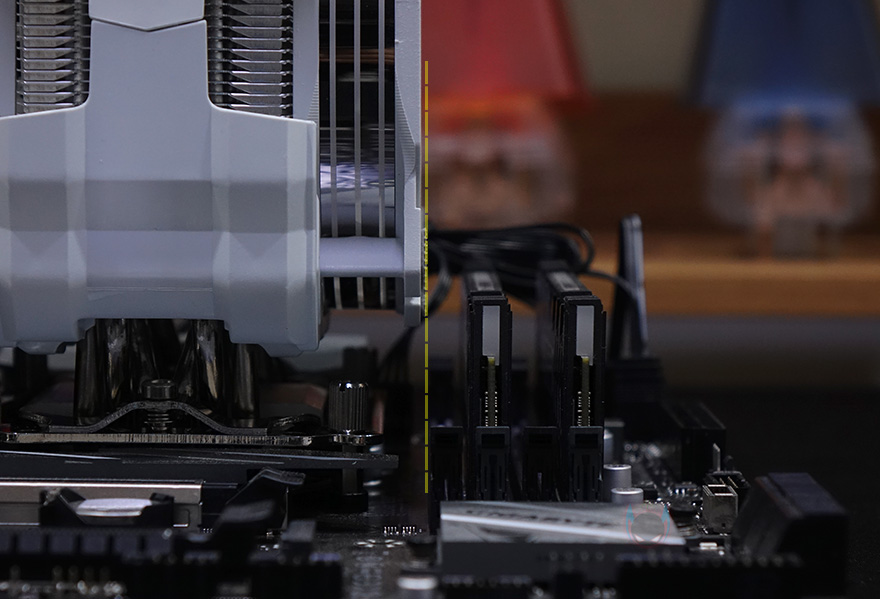 그럼, 직접 M120D Plus 쿨러를 사용해보는데, 일단 장착은 제공되는 와셔와 너트를 인텔/AMD 공용 백플레이트에 자신이 사용하는 CPU 소켓 규격에 맞춰 결합해줍니다. 그리고, 메인보드 후면에서 그대로 끼워주고, 스탠드 볼트로 체결한 다음에, 인텔/AMD 공용 마운트를 올려주고, 너트로 체결해줍니다. 물론, 마운트를 올려주기 전에 CPU에 써멀컴파운드를 도포해놔야합니다. 마운트까지 체결했다면, 마무리도 쿨러를 올려서 앞서 언급한대로 제공되는 공구 드라이버를 사용해 쿨러에 장착된 리테션의 나사로 마운트와 체결합니다. 그럼, 장착이 마무리 되고, 장착 후 메모리 슬롯과의 간섭여부를 확인해보면 1번 슬롯과 거의 맞닿는 수준이라 일부 메모리 제품은 간섭이 생길 수 있겠습니다. 또한, 듀얼팬을 구성하고 있는만큼 메인보드 백패널 I/O 방향에 배치되는 히트싱크 면적에 따라서도 간섭이 생길 수 있는데, 필자의 메인보드에 장착해본 결과, 정확히 70mm까지는 간섭이 생기지 않겠습니다.