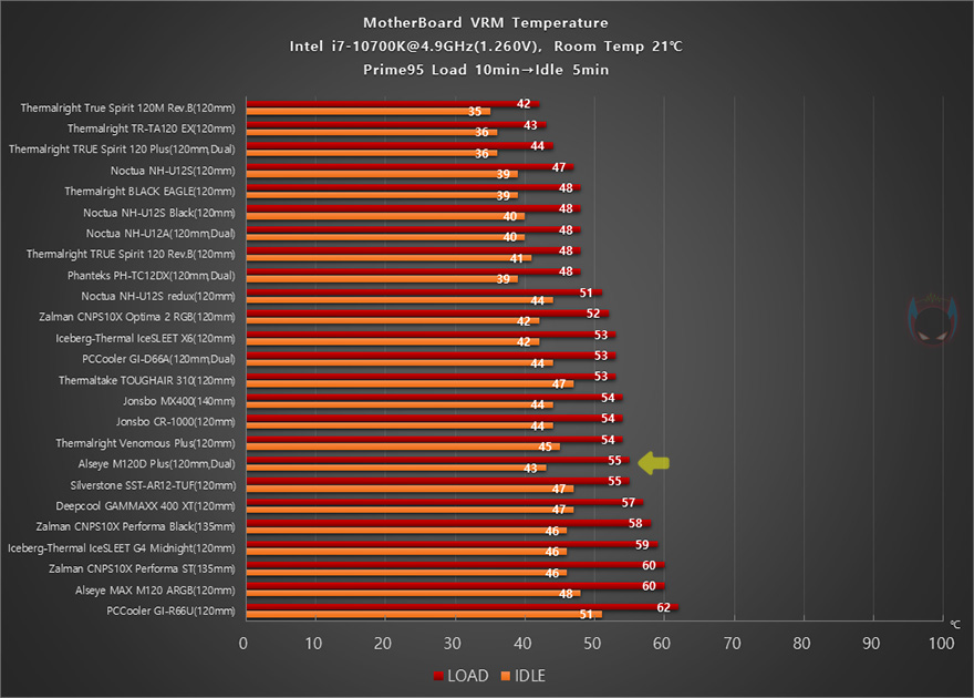 그럼, 이제 알스아이(Alseye) M120D Plus 쿨러의 쿨링성능을 알아봐야하는데, CPU는 인텔 i7-10700K로 1차 오버클럭(4.8GHz)과 2차 오버클럭(4.9GHz)으로 나뉘어서 진행했으며, Prime95를 10분간 100% 과부하 Load 상태에서 온도와 이후 5분간 Idle로 돌아간 상태에서 온도를 측정했습니다. 또한, 메인보드 전원부에 미치는 쿨링효과도 모니터링 소프트웨어를 통해 확인했습니다.