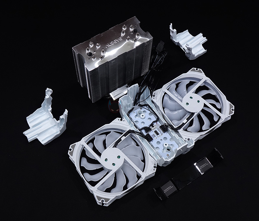 분해한 상태에서 이번엔 히트싱크만 잠깐 살펴보면, 디자인은 의외로 단순하며, 방열핀은 총 50개가 사용되었고, 방열핀 중앙에는 알스아이(Alseye) 로고를 새겨놨으며, 히트파이프와 방열핀의 통과처리는 수작업의 관통식입니다. 그리고, 커버에 연결된 케이블은 메인보드에 연결되는 PWM 4pin과 S-ATA, 5V ARGB 헤더에 연결되는 케이블 총 3가지 입니다.