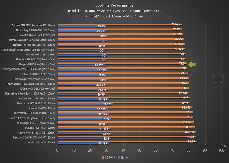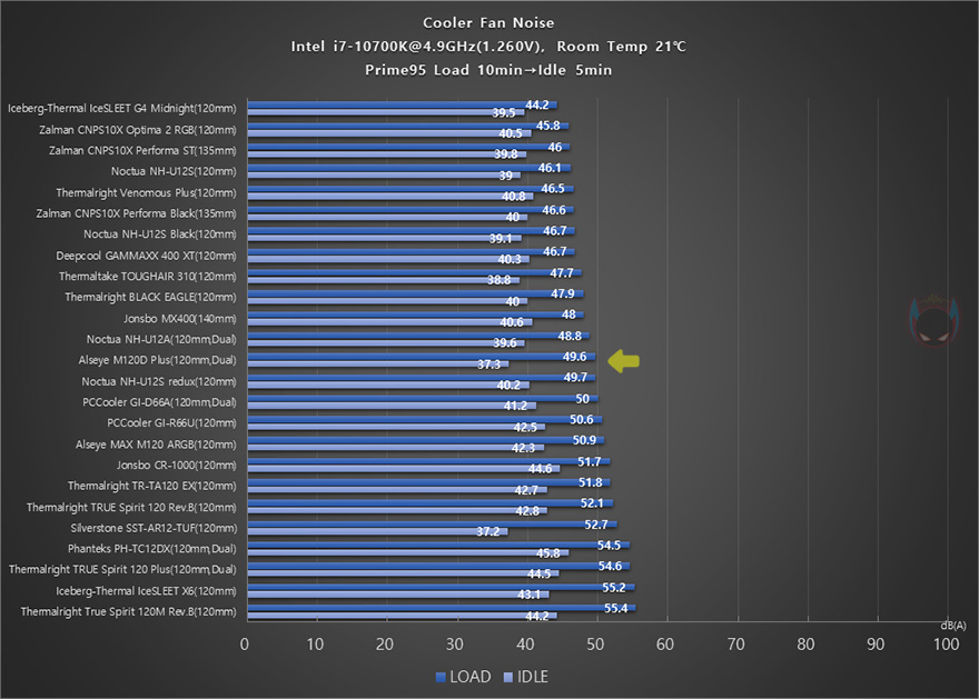 이번에 2차 오버클럭(4.9GHz) 상태에서 M120D Plus 쿨러의 쿨링성능을 확인해보면, 1차와 비슷하게 CPU온도는 전체 비교 쿨러들 중에서 상급에 속하는 결과를 보여줬으며, 역시 120mm 듀얼-팬 구성 쿨러 중에서는 3번째로 좋은 결과를 보여줬습니다. 메인보드 전원부 쿨링영향도 1차와 비슷하게 듀얼-팬 구성치고는 영향이 약한 편이죠. 그리고, Load상황과 Idle상황에서 각각 팬 속도와 소음도 측정해봤는데, 속도경우 Load에선 최대 속도에 근접한 모습을 보여주고, Idle에선 최소속도에 근접 작동되는걸 확인할 수 있습니다. 10cm 거리를 두고 측정한 소음 결과값은 듀얼팬 구성인점과 속도를 고려했을 때 정숙한 편이라 할 수 있습니다. 그래서, 전체적으로보면, 듀얼-팬 구성으로 CPU에 대한 쿨링성능은 만족스럽지만, 반대로 듀얼-팬 구성임에도 메인보드 전원부의 쿨링영향이 크지 않은 이유는 팬 위치의 영향이라 볼 수 있겠습니다.