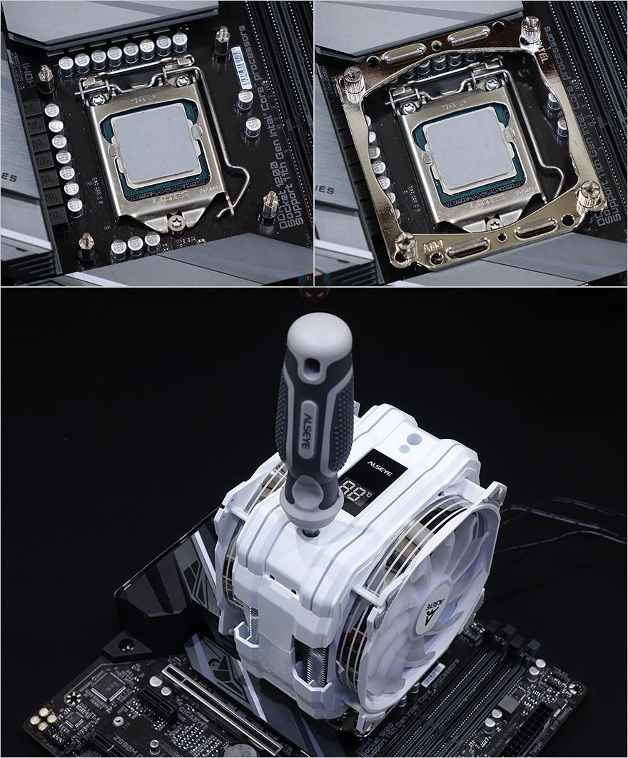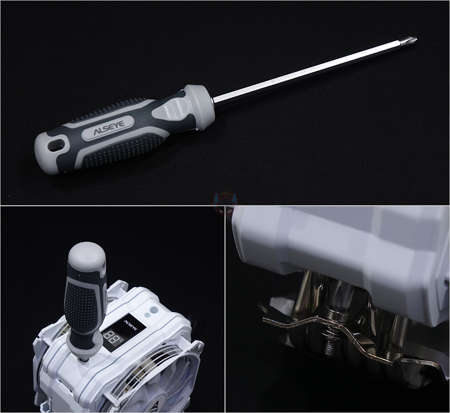 M120D Plus 쿨러는 팬 장착과 함께 커버 디자인을 적용하고 있는데, 쿨러 상단을 덮고 있는 커버에는 중앙에 블랙색상의 커버가 있으며, 이를 제거하면 중앙에 알스아이(Alseye) 로고와 함께 온도표시계를 볼 수 있습니다. 그리고, 위/아래로 각각 구멍이 있는데, 이 구멍에는 제공되는 공구 드라이버를 이용해, 쿨러 하단에 기본 장착된 리테션의 나사를 체결할 때 사용됩니다. 그리고, 쿨러 하단의 CPU와 맞닿는 베이스는 히트파이프가 그대로 접촉되는 일명 DTH방식이며, 지름 6mm 히트파이프 6개가 사용되었습니다.