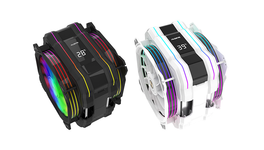 그럼, 본격적으로 알스아이(Alseye) M120D Plus 쿨러를 살펴보면, 시작에서도 잠깐 언급했지만, 블랙색상이 먼저 출시되었고, 최근에 화이트 색상이 출시되어서, 디자인은 블랙색상과 동일합니다. 일단, 전후면으로 120mm 팬이 각각 기본 장착되어 듀얼-팬을 구성하고 있죠. 팬 날개(블레이드)는 총 11개로 RGB조명효과를 위해 반투명으로 처리되어 있습니다.