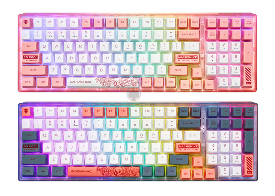 1세대와 동일한 98키 배열을 가졌기 때문에, Capslock과 Numlock, 무선 연결, 배터리 표기상태를 보여주는 LED 인디케이터도 숫자 키패드와 엔터 키 사이에 배치되어 있습니다. 그리고, 키-캡에서도 클리어 컬러 색상에 맞춰서 투-톤 컬러로 적용하고 있는데, 에코(Echo) 같은경우에는 핑크&화이트(Pink&White) 색상으로 적용하고 있으며, 일부 키-캡에는 포인트로 로고나 캐릭터 디자인도 새겨놨습니다.