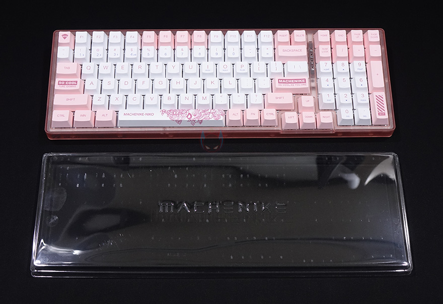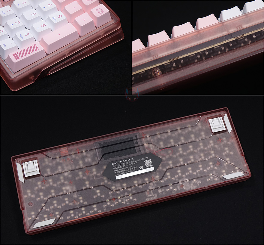 본격적으로 Machenike(메카닉) K600 2세대(Gen2) 키보드를 살펴보면, 2세대 모델 역시 2가지 색상(color)으로 출시되었습니다. 바로 하우징 케이스 색상으로 핑크와 블루인데, 제조사에선 각각 에코(Echo), 델타(Delta)라고 명칭하고 있습니다. 물론, 1세대와 비교했을 때는 98키 배열은 그대로 유지하지만, 한눈에 봐도 케이스부터 키-캡까지 디자인 색상이 완전히 다르죠. 시작에서도 언급했듯이 클리어 컬러(Clear color) 케이스를 적용하고 있습니다. 키보드 밑바닥부분은 보면 더 확실히 클리어 느낌을 살리고 있죠.