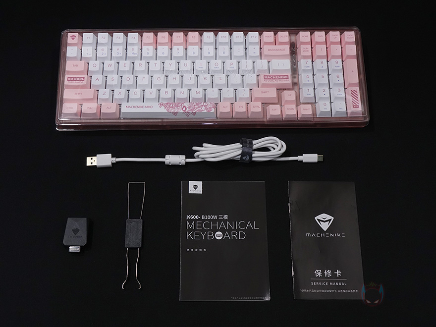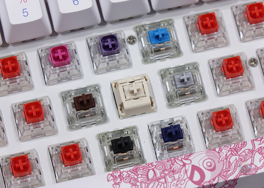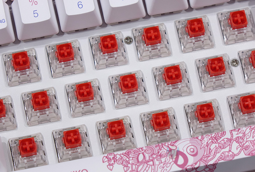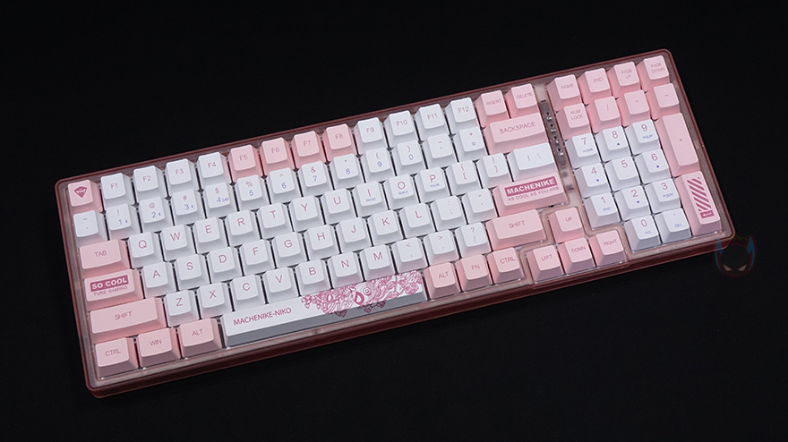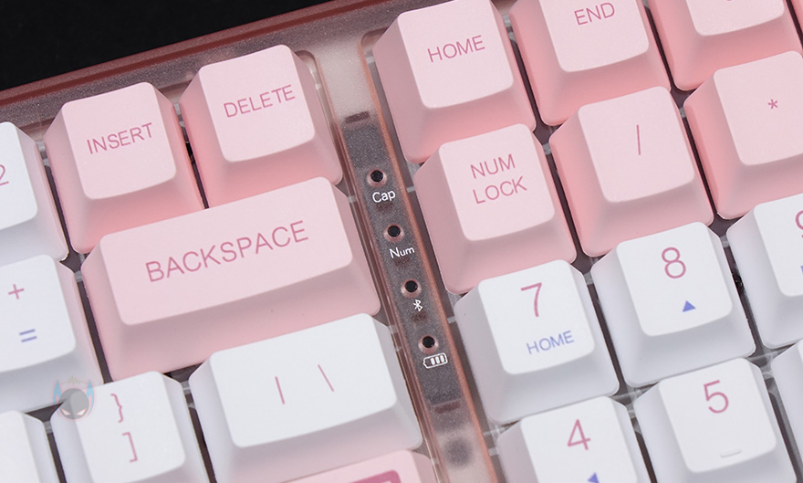 1세대와 동일한 98키 배열을 가졌기 때문에, Capslock과 Numlock, 무선 연결, 배터리 표기상태를 보여주는 LED 인디케이터도 숫자 키패드와 엔터 키 사이에 배치되어 있습니다. 그리고, 키-캡에서도 클리어 컬러 색상에 맞춰서 투-톤 컬러로 적용하고 있는데, 에코(Echo) 같은경우에는 핑크&화이트(Pink&White) 색상으로 적용하고 있으며, 일부 키-캡에는 포인트로 로고나 캐릭터 디자인도 새겨놨습니다.
