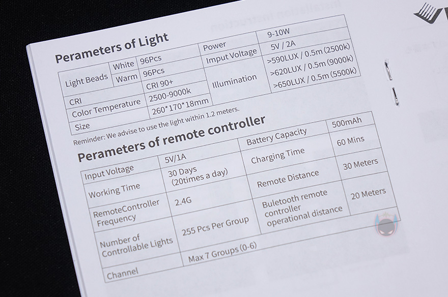 박스를 열어보면, 포장은 외부충격 방지를 위해 우레탄폼 완충제를 사용하고 있으며, 조명 본체는 비닐포장에 흔들리지 않게 역시 우레탄폼에 포장되어 있으며, 아래에는 부속품들이 역시 우레탄폼에 흔들리지 않게 끼워진 상태로 포장처리되어 있습니다. 제품 구성은 조명 본체, 무선 리모컨, 마그네틱, 분리형 USB 전원케이블, 확장 볼헤드 폴대, 제품설명서로 이루어져 있으며, 제품설명서에 제품의 기본사양을 확인할 수 있습니다. 개인적으로 이 제품을 선택한 이유 중 하나는 바로 전력소모로 뒤에서 확인하겠지만, USB Type-C 타입으로 10W의 전력만 사용됩니다.